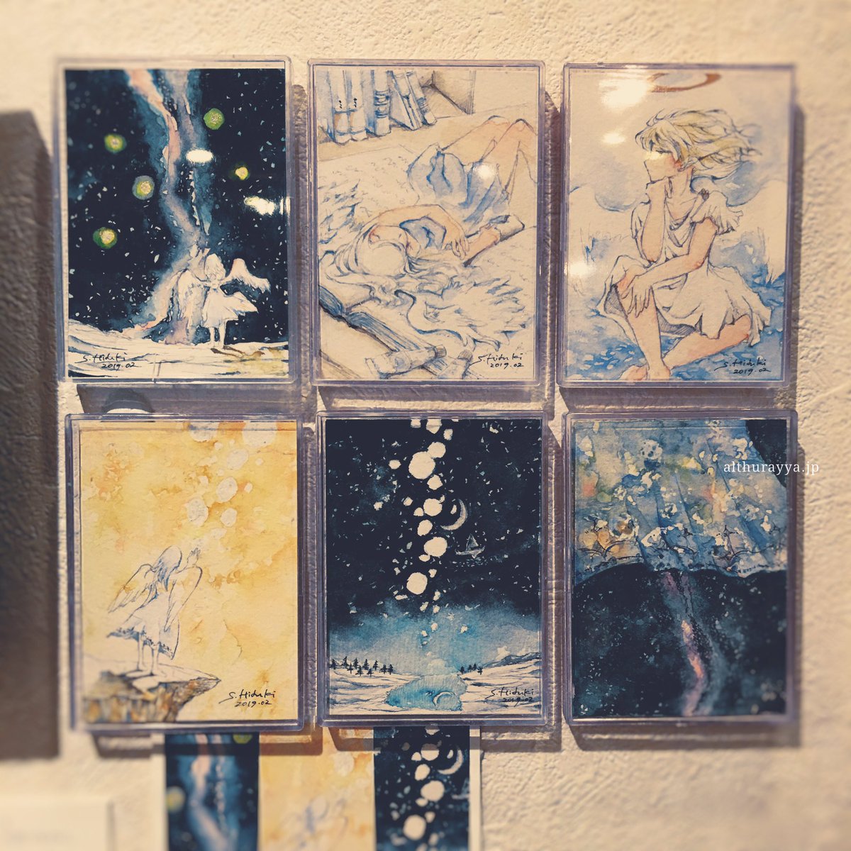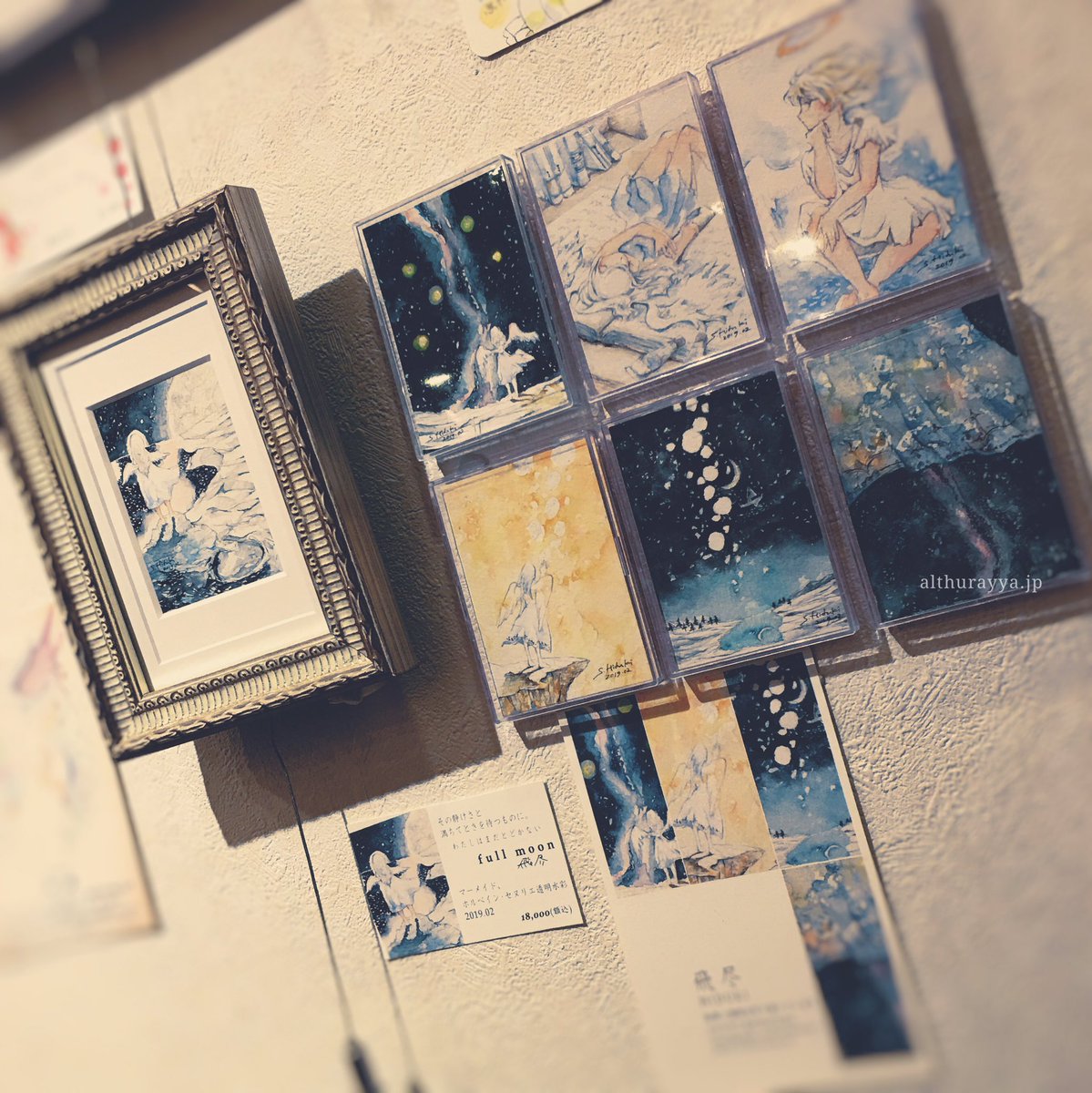 2年半ぶりというていたらくです。為体を地で行きます。 終わってからのご報告で誠に申し訳ないのですが、ATCという名刺サイズくらいのカードに描かれた作品だけの展示に、初めて出てみたりしていました。 素敵に飾っていただきました。 左上(星の灯と銀河)と、右上(横顔)の作品は、お迎えがきまって個人蔵に。 【 雨宿りの夜 】 ご縁があったら嬉しいです。 額装ATCは、会場ではお値段をつけていたのですが、やっぱり手放したら後悔する気がして、しばらく手元に置くことにしました。線画の段階からとても気に入っていて、思い入れのある作品です。 他の方の作品もとても細やかで丁寧で、忘れがちですが、ATCってめちゃめちゃ小さくて。いざ紙に相対すると、ええーこんなに小さいっけ!ってなるのですが、描き慣れてきたら楽しかったよね。 |